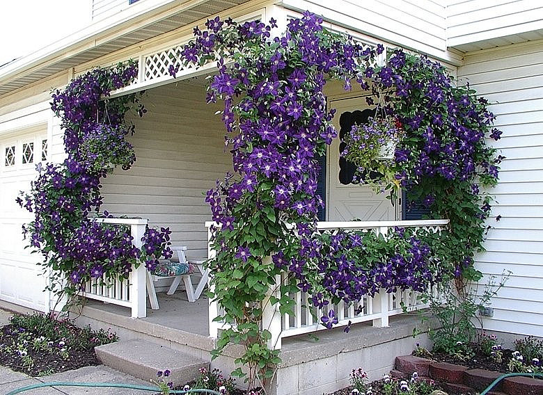 Парадный вход может стать удивительным местом, словно входом в дом цветочной феи! Высадите у крыльца клематисы, которые оплетут вход
