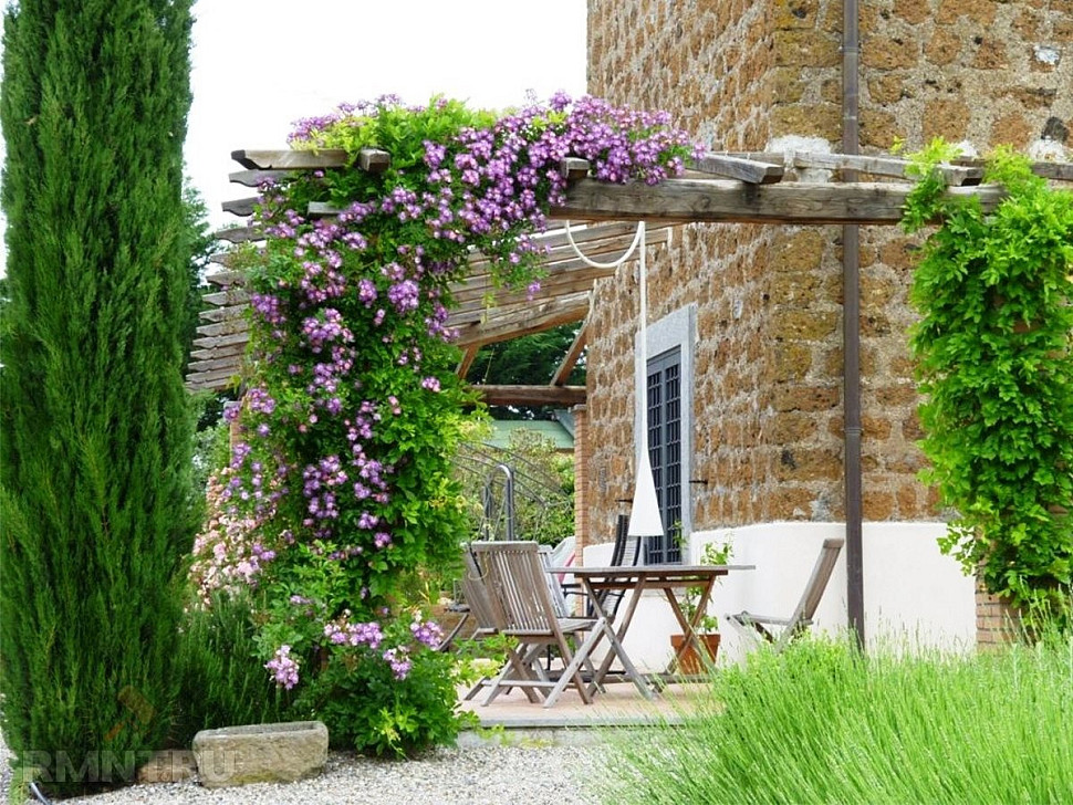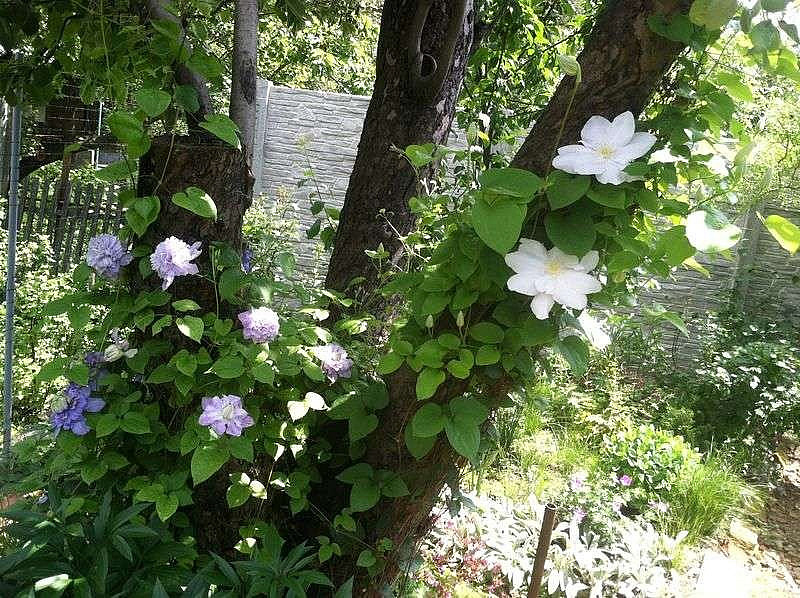 Не меньше сказки добавят клематисы, которые оплели стволы деревьев! Чтобы осуществить такую идею необходимо высаживать растение с солнечной стороны дерева и следить, чтобы не было сильного затенения кроной