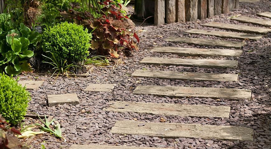 Галька выглядит более декоративно, чем гравий, а плитняк органично перекликается с ней. Такая дорожка добавляет саду приземленности и устойчивости. Важно следить за тем, чтобы плитняк отличался по цвету от гальки