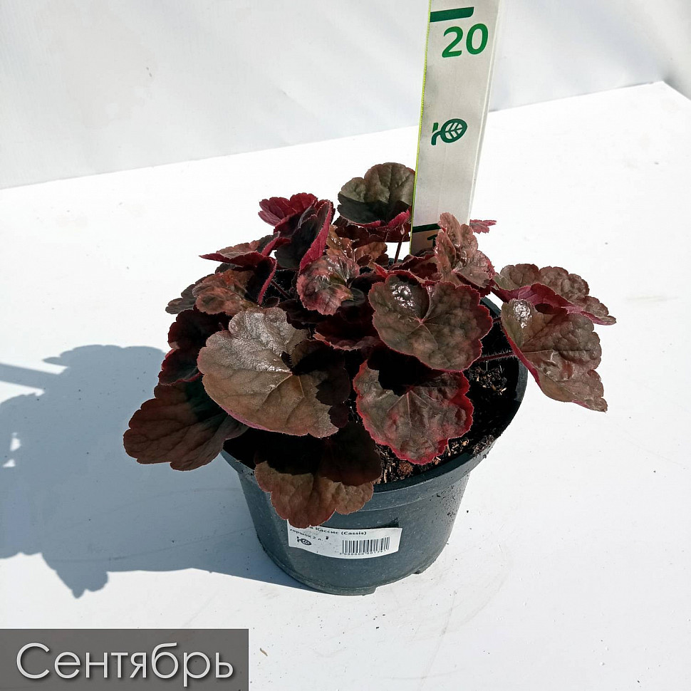 Листья многолетника матовые, имеют зелено-шоколоднаю окраску с красной окантовкой. Цветки у гейхеры Кассис ярко-розовые, почти вишневые, колокольчатой формы, собраны в пышные метелки. Цветоносы возвышаются над основным растением на 15-20 см. Цветет в июне-июле.