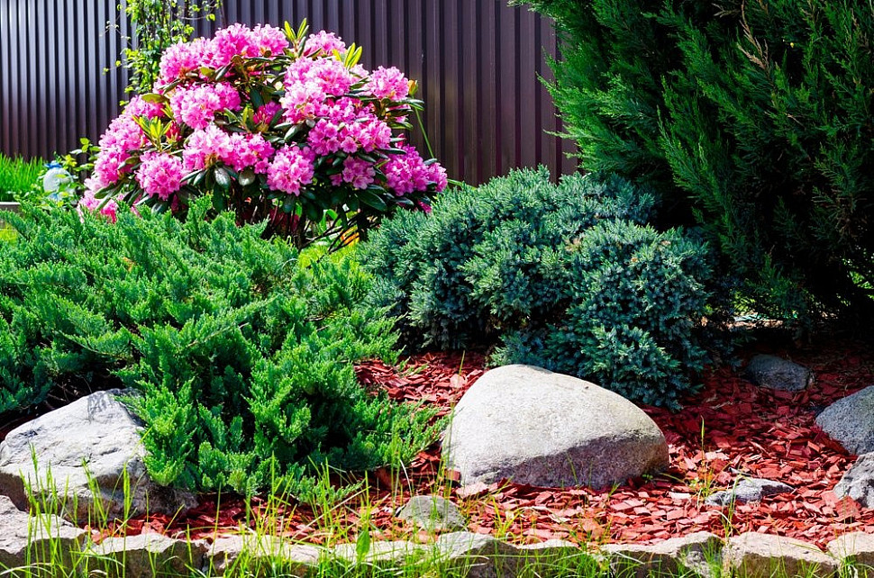 Хвойные растения идеальные соседи для рододендрона. Лучше всего выбирать однотонные с более темной хвоей, чтобы создать контраст. Для этого подойдут: