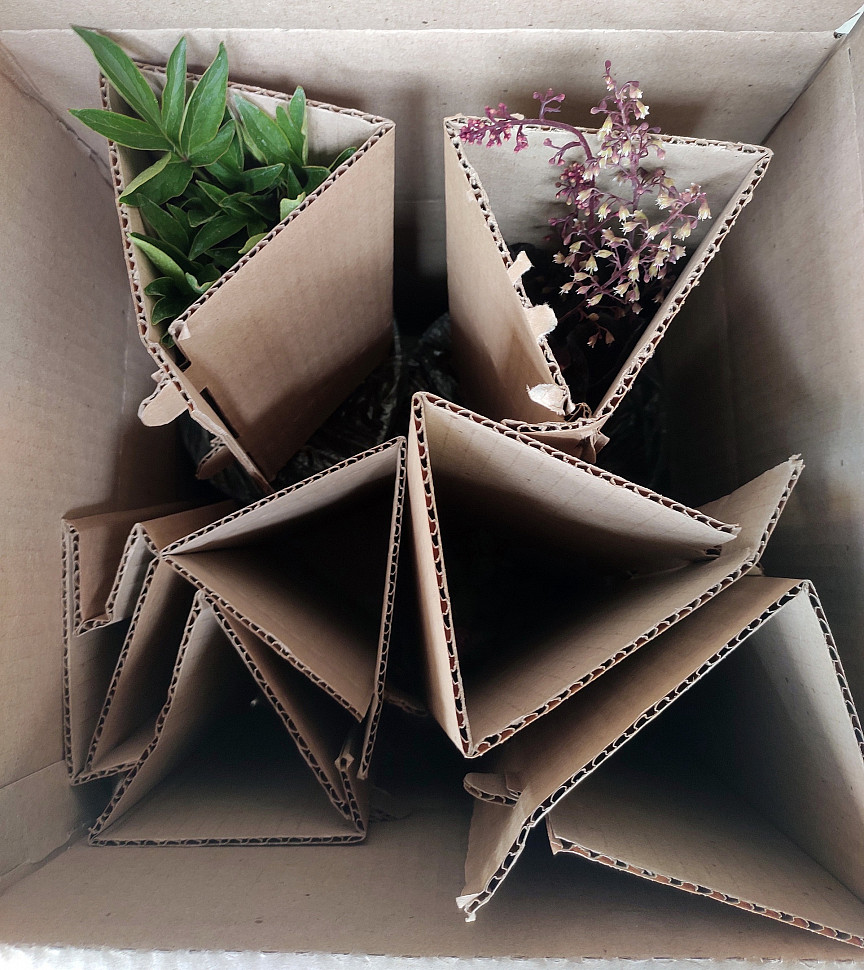 Горшки надежно закрепляются картонными ремешками в коробке. Благодаря этому никакие опасности перевозки не страшны росткам.