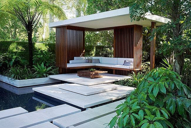 📌С помощью террасы удобно выделять зону отдыха с беседкой, патио или прудом. При этом она не обязательно должна быть очень высоко поднята, достаточно сыграть на контрасте фактур между газоном и материалом террасы.