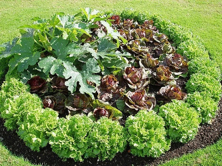 Удивительный способ обустройства своего огорода в виде цветников. За основу берутся самые обычные виды цветников, а вместо декоративных растений используются овощные культуры. Так например очень легко можно сделать прекрасную композицию из разных сортов салата и капусты!