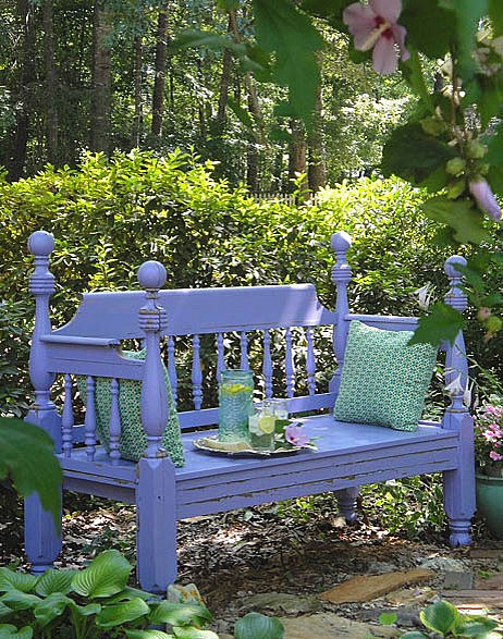 🌺Прекрасный акцент в саду добавить яркая лавочка, особенно если ее цвет продублировать цветущими растениями по бокам. Эта новая струя внесет свежее дыхание в привычный сад.