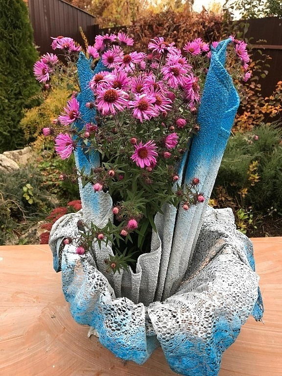 Звучит абсурдно, но поверьте, результат точно вас удивит! Для этого лайфхака вам потребуется цемент старые тряпки и краска. Замешайте цемент и полностью окуните в него тряпку. После ее нужно будет аккуратно повесить на ведро или нечто подобное с ровным дном. Дайте цементу высохнуть, снимите тряпку с подставки и у вас практически готовый оригинальный вазон. Покрасьте его так, как вам хочется и высадите в него растения!