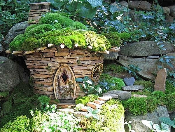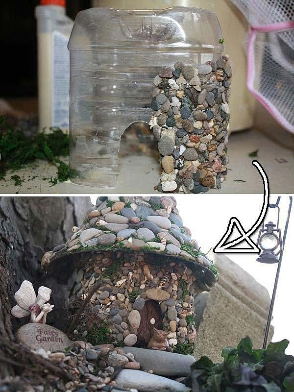 Вот это точно внесет в ваш сад сказку, при том, что сделать такое не трудно! Для сооружения домика потребуется чистая галька, пластиковая бутылка и клей. В качестве клея удобно использовать клеевой пистолет, но и обычный супер-клей тоже подойдет. Наметьте на бутылки окна и дверь и осторожно вырежьте их. Методично обклеивайте галькой бутылку - домик готов. В качестве крыши можно использовать кору дерева.