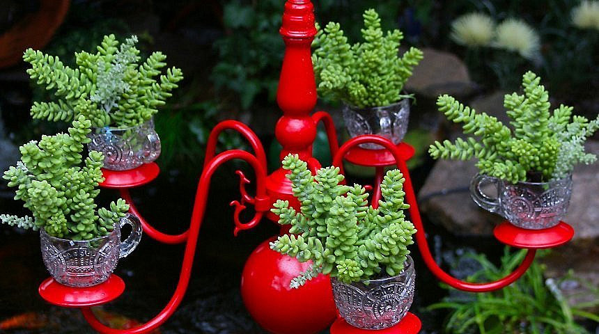 Если у вас где-то завалялась старая люстра, то может быть это ее шанс на вторую жизнь. Единственное над чем придется поработать - подобрать емкости для растений по размеру люстры. Лучше всего, если сама люстра будет окрашена в яркий цвет, так вы создадите контраст с растениями и выгодно подчеркнете их.