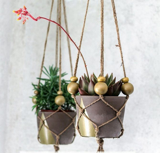 В качество оригинального подвесного кашпо может подойти плетение из веревок. Ритмичные узоры и переплетенные веревки придадут особый шарм вашему кашпо. Более того вы можете это сделать легко и украсить так, как вам хочется